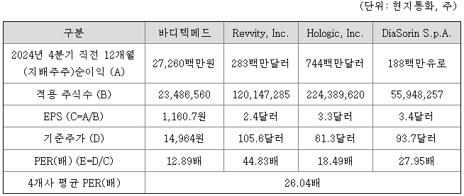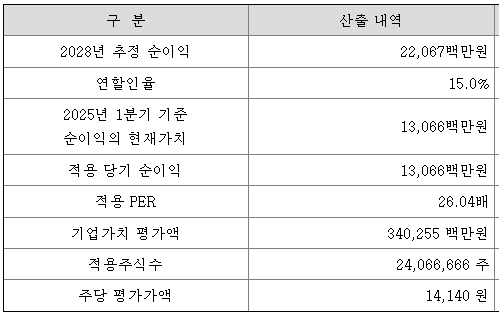 회사의 주당 평가가액은 2028년 추정 순이익을 할인하여 현재가치로 환산한 후, 유사회사의 평균 PER 배수를 곱하여 회사가치를 정하고, 이를 주식 수로 나누어 산출한 것입니다.