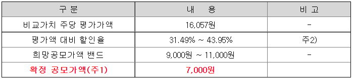 당초 공모 희망 가격 하단보다 2,000원 하향 조정된 7,000원으로 결정된 것입니다.