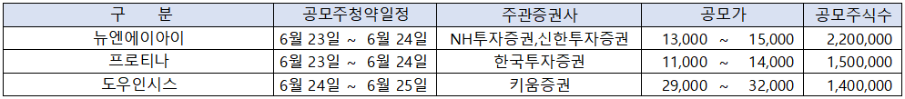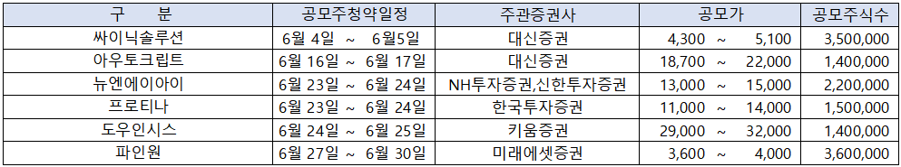 현재까지 파악된 2025년 6월의 공모주 청약 일정을 보면, 모두 6곳의 일반 공모주가 청약을 준비 중인 것으로 나타났습니다.