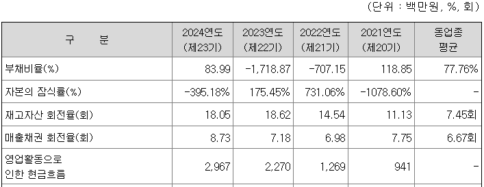 동사의 부채비율은 2024년 기준 83.99% 수준을 보이고 있으며 차입금의존도는 35.01%, 유동비율은 57.48%를 보이고 있습니다. 유동비율을 제외한 동 재무안정성 비율은 업종평균 대비 열위한 모습을 보이고 있으나 연도별로 비교하면 2021년 이후로 차입금의존도는 지속적으로 개선되고 있으며, 2021년 대비 부채비율 또한 개선세를 보이고 있습니다.