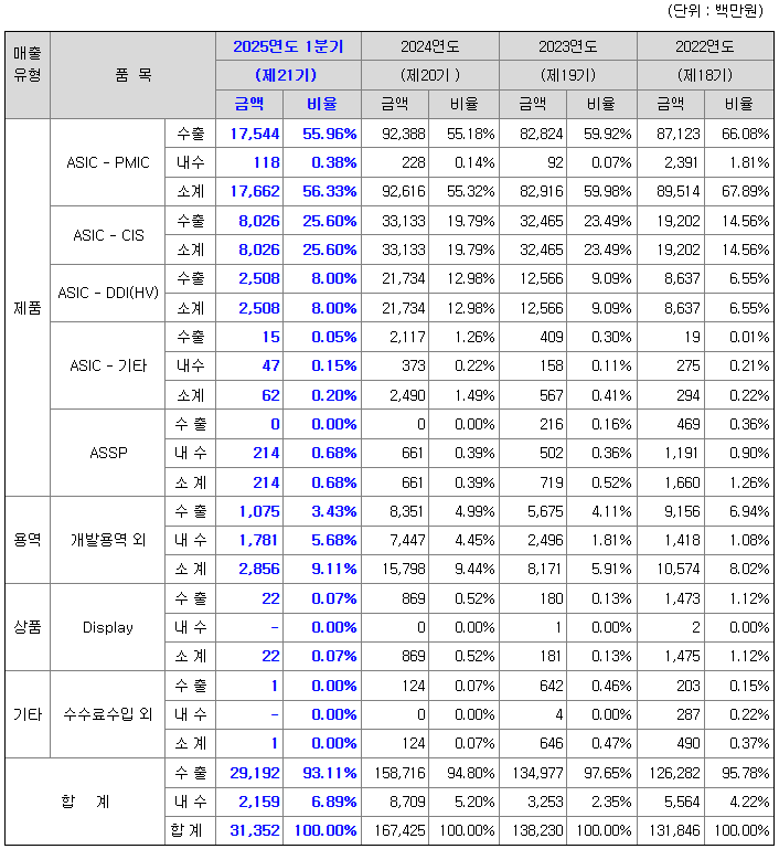디자인하우스로서의 역할을 통하여 발생하는 ASIC(Application Specific Integrated Circuit) 개발 및 양산 매출 이외에 제품 기획단계부터 개발협력사와 공동으로 개발하여 부품 및 세트 메이커들에 대한 판매 수익을 공유하는 제품 (ASSP : Application Specific Standard Product) 매출과 파운드리 고객사의 시스템 반도체 완제품의 판매 대행도 사업의 한 축을 담당하고 있습니다.