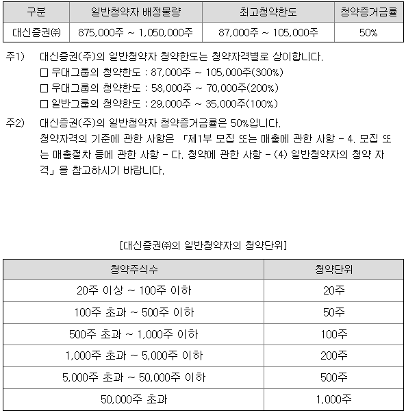 대신증권의 일반 청약자 배정 물량은 875,000주 ~ 1,050,000주이고, 일반 청약자의 최고 청약 한도는 일반그룹 기준 29,000주 ~ 35,000주입니다.