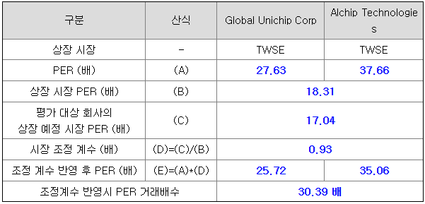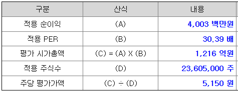 <유사회사의 평균 PER 배수 산정>