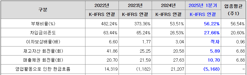 동사의 부채비율은 자회사인 도우인시스 VINA(이하 '베트남 생산법인')에 대한 투자를 위한 자금 조달 과정에서 2022년 482.24%, 2023년 373.36%로 높은 수준이었으나, 전환사채의 보통주 전환을 통해 2024년 53.51% 및 2025년 1분기말 56.22%로 부채비율을 유의미하게 개선되었습니다.