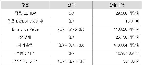 회사의 주당 평가가액은 2024년 온기 EBITDA에 유사회사의 평균 EV/EBIRDA배수를 곱하여 회사가치를 정하고, 이를 주식 수로 나누어 산출한 것입니다.