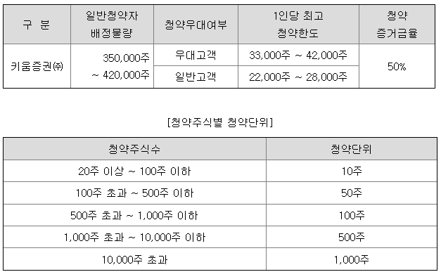 키움증권의 일반 청약자 배정 물량은 350,000주 ~ 420,000주이고, 일반 청약자의 최고 청약 한도는 일반고객 기준 22,000주  ~ 28,000주입니다.