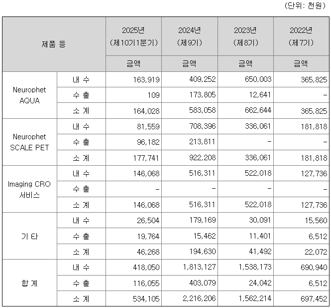 뉴로핏의 주요 기술제품은 알츠하이머병과 관련된 모든 의료 영상(MRI, PET-CT)을 분석 하여 알츠하이머병의 진단, 치료제 처방 결정 및 치료 효과(아밀로이드 감소량) 정량화, 항아밀로이드 치료제의 부작용 모니터링 및 중증도 판단이 모두 가능합니다. 뉴로핏의 핵심기술 제품 AQUA(MRI 기반 뇌신경 퇴화 및 손상 분석 소프트웨어)는 각 뇌영역의 부피를 정확하게 측정하고 동일 연령 및 성별의 정상인과 통계비교를 함으로써 비정상적 위축을 판단할 수 있도록 하여 치매의 정확한 진단을 조기부터 가능하도록 돕는 소프트웨어입니다. 또한, 제품 SCALE PET(PET 영상 화학표지자 자동 정량분석 소프트웨어)은 뇌 영역마다 아밀로이드베타(Aβ) 단백질 등이 얼마나 쌓였는지를 정확하게 측정하여 정량적 판단을 통해 진단 정확도를 높일 수 있습니다. 위 두 개의 핵심 제품과 더불어 최근 알츠하이머병 치료제 개발 성공에 맞추어 치료제의 처방으로 인해 급격히 증가하는 영상 판독 업무의 부담을 줄이고, 치료 효과와 함께 부작용에 대한 중증도를 판단하는 제품 AQUA AD(알츠하이머 치료제 처방/예후관찰/부작용 분석 소프트웨어)를 개발 및 제품화하였습니다. 동사는 위와 같이 의료진을 보조할 수 있는 AI 솔루션을 검진센터 및 2차/3차 병원에 공급하고, 신약 개발을 위한 임상시험 시 뇌영상을 통해 환자의 선별이나 치료효과를 분석하는 Imaging CRO 서비스를 글로벌 제약회사 및 신약개발 회사에 제공하는 사업모델을 보유하고 있습니다.