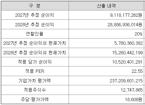 회사의 주당 평가가액은 2027년과 2028년의 추정 순이익을 할인하여 현재가치로 환산한 후, 유사회사의 평균 PER배수를 곱하여 회사가치를 정하고, 이를 주식 수로 나누어 산출한 것입니다.