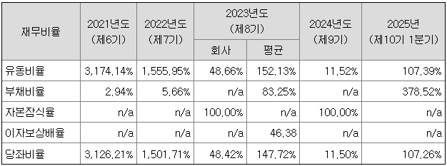 뉴로핏은 2019년 60억원, 2020년 30억원, 2021년 190억원, 2023년 204억원의 지속적인 유상증자를 통하여 재무구조를 개선하고자 노력하였으나, 2025년 1분기말 기준 동사는 유동비율 107.39%, 부채비율 378.52%, 당좌비율 107.26%을 기록하여 동종업종 평균 대비 열위한 수준을 나타내고 있습니다. 2023년 말 누적 결손금의 경우 (-)407억원을 기록하였습니다. 또한 전환상환우선주의 부채인식에 따라 2023년과 2024년 완전자본잠식 상태를 기록하였습니다. 다만, 전환상환우선주의 보통주 전환이 2025년 1분기에 완료되어 자본으로 재분류됨에 따라 동사의 재무안정성 수치는 개선되었습니다. (단, 2025년 상반기말 공모자금 유입 직전 기준은 완전자본잠식 가능성 있음)