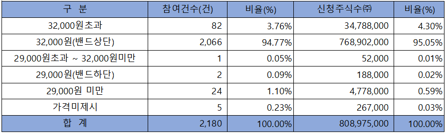 수요예측 참여 건수는 총 2,180건에 신청 주식수 808,975,000주로, 참여 경쟁률 785.41 : 1의 실적을 기록했습니다.