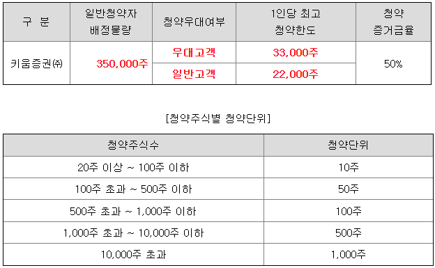 키움증권의 일반 청약자 배정 물량은 350,000주이고, 일반 청약자의 최고 청약 한도는 일반 고객 기준 22,000주입니다.
