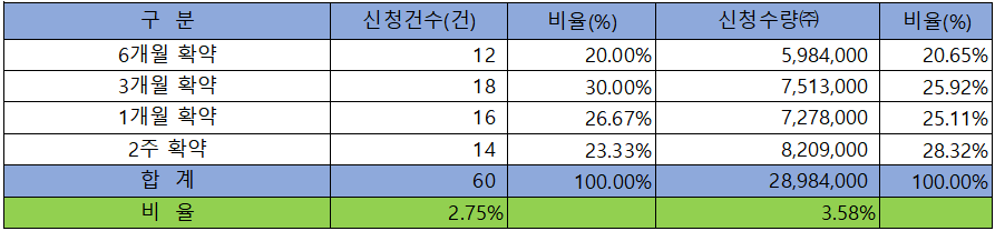 의무 보유 확약 건수는 60건에 28,984,000주로 전체 신청 물량 대비 건수로는 2.75%, 수량으로는 3.58%였으며, 2주 확약 비중이 제일 높았고, 1개월 ~ 3개월 확약 내용도 비슷한 수준입니다.