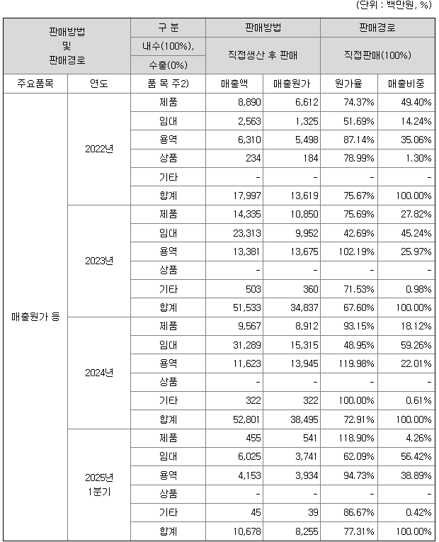 엔알비의 매출총이익률은 2022년 24.3%, 2023년 32.4%, 2024년 27.1%로 2023년까지 증가하다가 소폭감소하였습니다. 매출총이익률이 2024년에 감소한 주된 이유는 임대 모듈러 자산의 증가로 누적된 감가상각비용, 모듈러 설치, 이동과 관련한 외주인력 비용 증가 등에 따른 것입니다. 연도별 거래 형태에 따른 매출액 및 매출원가, 매출원가율은 아래와 같습니다. 2025년 1분기의 경우 공동주택 등 제작을 위한 인력충원, 생산설비 투자로 인한 감가상각비의 증가로 매출총이익률이 전년 대비 소폭 감소하였습니다.