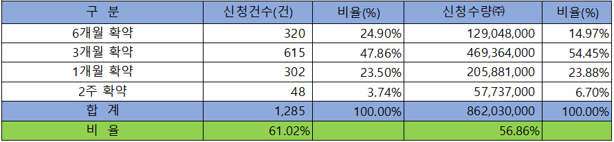 의무 보유 확약 건수는 1,285건에 862,030,000주로 전체 신청 물량 대비 건수로는 61.02%, 수량으로는 56.86%였으며, 3개월 확약 비중이 제일 높았습니다.