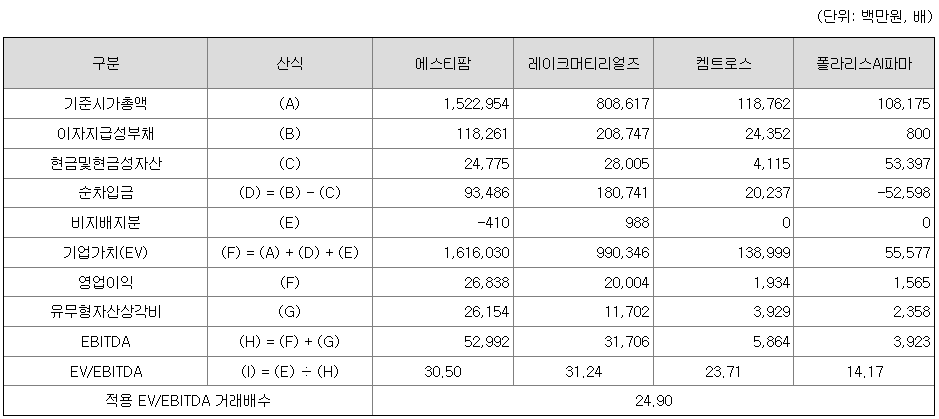 <유사회사의 평균 EV/EBITDA 배수 산정>