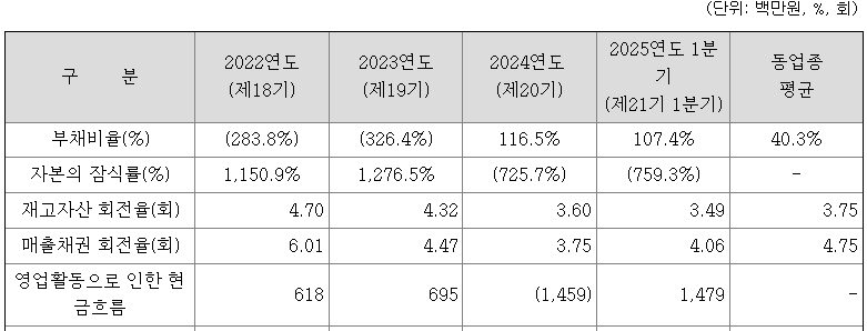 동사는 과거 누적된 결손으로 인한 음의 자본총계로 음의 부채비율과 양의 자본잠식률을 나타내고 있으며, 2024년 12월 기준 발행된 종류주식이 전량 보통주로 전환됨으로써 자본 확충으로 2024년 말 기준 부채비율은 116.5%, 자본의 잠식률은 (725.7%)를 실현하였고, 2025년 1분기 역시 개선세를 나타내고 있습니다.