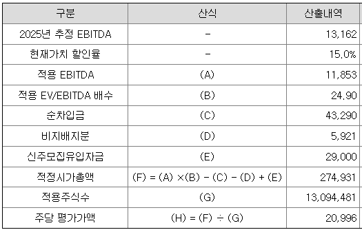 회사의 주당 평가가액은 2025년 추정 EBITDA에 유사회사의 EV/EBITDA배수를 곱하여 회사가치를 정하고, 이를 주식 수로 나누어 산출한 것입니다.