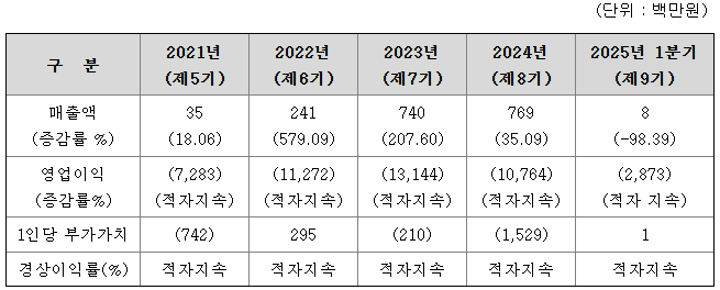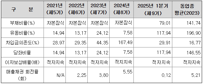 동사는 21년 말부터 ‘24년 말까지 자본잠식 상태이므로 부채비율이 산정되지 않았습니다. 부채총계는 `21년 말 684억원에서 `24년말 1,449억원으로 765억원 증가하였는데 유동상환전환우선주부채가 `24년말 기준 990억원으로 `23년말 411억원 대비 579억원 증가한 점과 `23년 전환사채 174억원 발행으로 인한 것입니다. 동사 상장예비심사 신청일 현재 기준으로는 상환전환우선주 및 전환사채가 전량 보통주로 전환이 완료되어 부채총계는 98억원으로 대폭 감소하였고, 자본총계는 기존 자본잠식에서 124억원으로 개선되어 부채비율은 79.01%로 ‘23년 업종평균을 상회합니다.