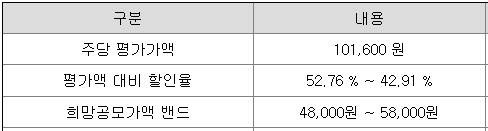 지투지바이오의 희망 공모가격은 회사의 주당 평가가액 101,600원에서 42.91% ~ 52.76% 할인한 가격입니다.