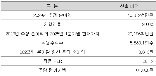 회사의 주당 평가가액은 회사의 2029년 추정 순익을 할인하여 현재가치로 환산하고, 이를 주식 수로 나누어 주당 순이익을 구한 다음 유사회사의 평균 PER 배수를 곱하여 산출한 것입니다.