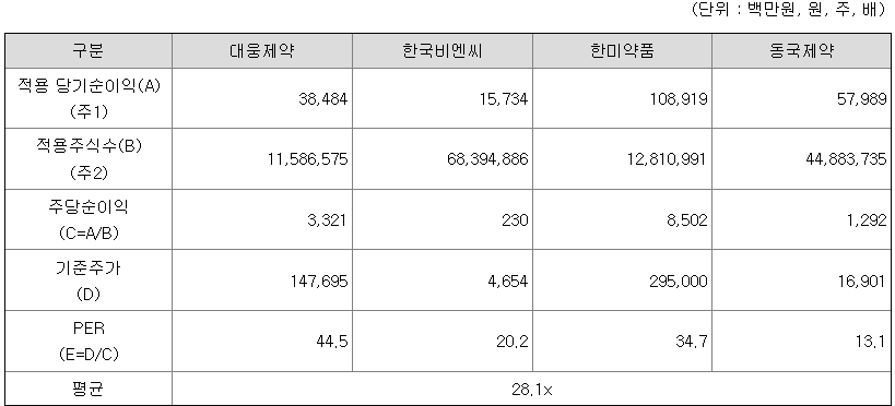<유사회사의 평균 PER 배수 산정>