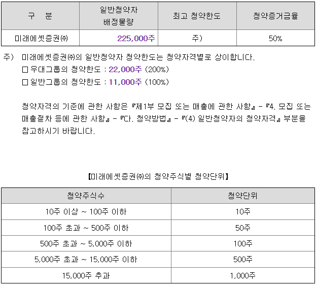 미래에셋증권의 일반 청약자 배정 물량은 225,000주이고, 일반 청약자의 최고 청약 한도는 일반그룹 기준 11,000주입니다.