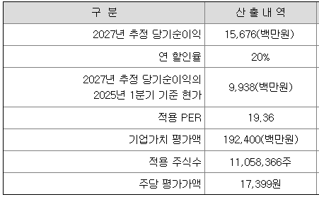 회사의 주당 평가가액은 2027년 추정 순이익을 할인하여 현재가치로 환산한 후, 유사회사의 평균 PER배수를 곱하여 회사가치를 정하고, 이를 주식수로 나누어 산출한 것입니다.