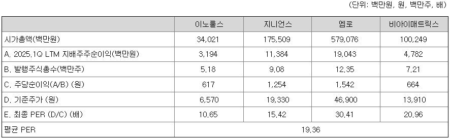 <유사회사의 평균 PER 배수 산정>