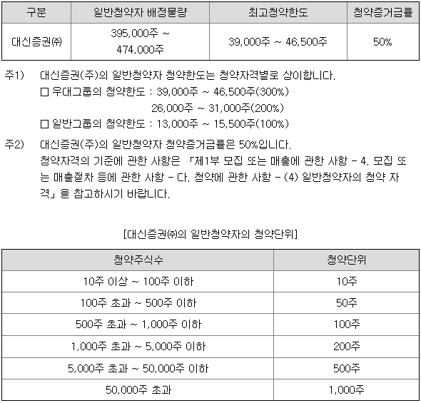 대신증권의 일반 청약자 배정 물량은 395,000주 ~ 474,000주이고, 일반 청약자의 최고 청약 한도는 일반그룹 기준 13,000주 ~ 15,500주입니다.