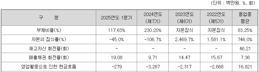 동사는 2023년까지 자본잠식 상태였으나, 2024년 상환전환우선주가 보통주로 전환됨에 따라 자본잠식 해소 및 부채비율이 개선되었습니다