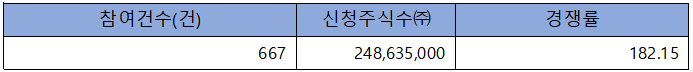 수요예측 참여 건수는 총  667건에 신청 주식수 248,635,000주로, 참여 경쟁률 182.15 : 1의 실적을 기록했습니다.
