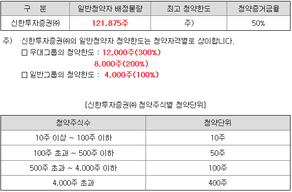 신한투자증권의 일반 청약자 배정 물량은 121,875주이고, 일반 청약자의 최고 청약 한도는 일반그룹 기준 4,000주입니다.