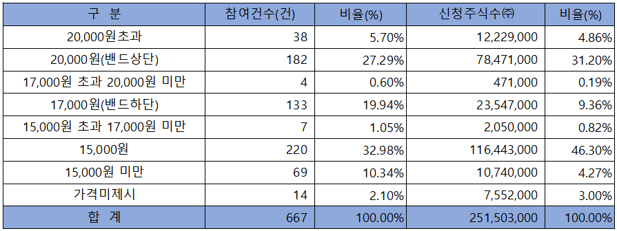 희망 공모가격 상단 이상 초과 신청 비율은 31.20%였으며, 하단 이하 15,000원 이하 신청 비율이 50.57%에 달했습니다.