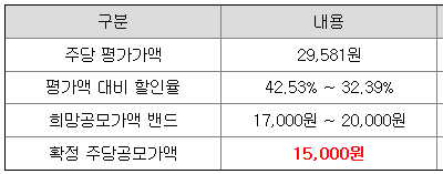 당초 희망 공모가격 하단 17,000원 대비 2,000원(11.76%) 하향 조정된 것입니다.