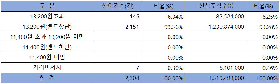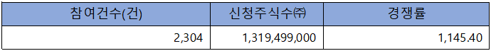 수요예측 참여 건수는 총 2,304건에 신청 주식수 1,319,499,000주로, 참여 경쟁률 1,145.40 ; 1의 실적을 기록했습니다.