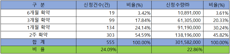 의무 보유 확약 건수는 555건에 301,582,000주로 전체 신청 물량 대비 건수로는 24.09%, 수량으로는 22.86%였으며, 2주 확약 비중이 제일 높았지만 1개월 확약과 3개월 확약에도 상당한 수량이 참여하였습니다.