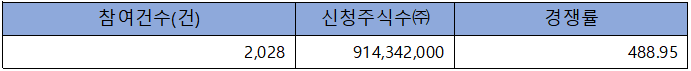 수요예측 참여 건수는 총 2,028건에 신청 주식수 914,342,000주로, 참여 경쟁률 488.95 : 1의 실적을 기록했습니다.