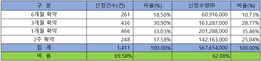 의무 보유 확약 건수는 1,411건에 567,654,000주로 전체 신청 물량 대비 건수로는 69.58%, 수량으로는 62.08%였으며, 2주~ 6개월까지 고른 분포를 보였습니다.