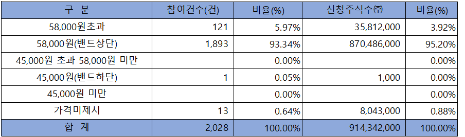 수요예측 참여 건수는 총 2,028건에 신청 주식수 914,342,000주로, 참여 경쟁률 488.95 : 1의 실적을 기록했습니다.