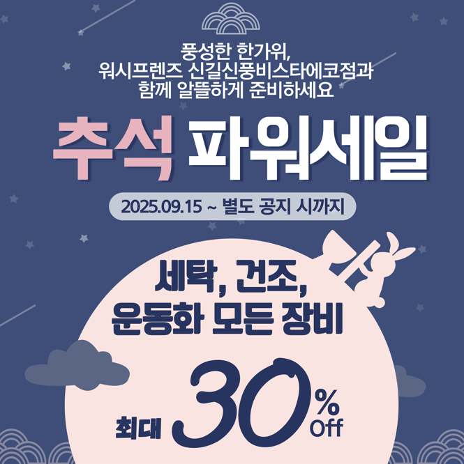 워시프렌즈 신길신풍비스타에코점에서는 무더위를 이기고 가을을 맞이하여 “추석맞이 파격 세일 이벤트”를 진행합니다.