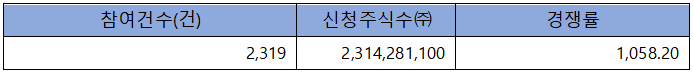 수요예측 참여 건수는 총 2,319건에 신청 주식수 2,314,281,100주로, 참여 경쟁률 1,058.20 : 1의 실적을 기록했습니다.