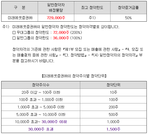 미래에셋증권의 일반 청약자 배정 물량은 729,000주이고, 일반 청약자의 최고 청약 한도는 일반그룹 기준 36,000주입니다.