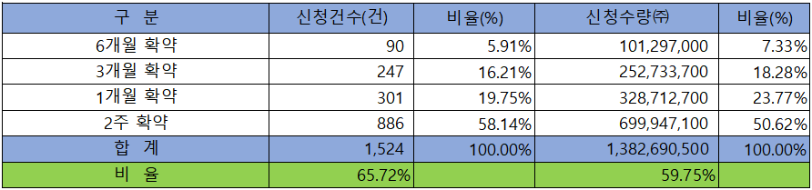 의무 보유 확약 건수는 1,524건에 1,382,690,500주로 전체 신청 물량 대비 건수로는 65.72%, 수량으로는 59.75%였으며, 2주 확약 비중이 제일 높았으나, 1개월부터 6개월까지 상당 수량이 신청하는 모습을 보였습니다.