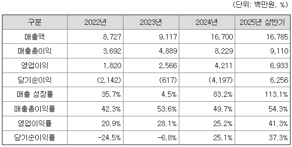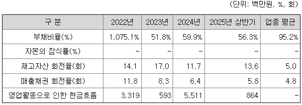 동사의 부채비율은 K-IFRS 도입으로 전환상환우선주 평가 관련 부채가 재무제표에 인식됨에 따라, 2022년 1,075.1%의 일시적으로 높은 수준을 보여주었습니다. 그러나, 2023년 전환상환우선주의 보통주 전환 및 유상증자를 통해 2023년 부채비율을 51.8%로 개선하였습니다. 또한, 2024년 매출 및 수주의 급증에 따른 매입채무 증가 영향으로 부채비율이 일시적으로 59.9%로 증가하였으나, 2025년 2분기 56.3%로 소폭 개선되었으며, 업종 평균(95.2%)과 비교 시 2023년 이후 안정적인 수준의 부채비율을 유지하고 있습니다