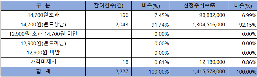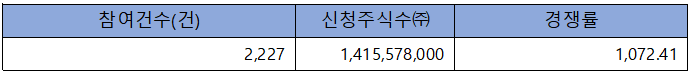 수요예측 참여 건수는 총 2,227건에 신청 주식수 1,415,578,000주로, 참여 경쟁률 1,072.41 : 1의 실적을 기록했습니다.