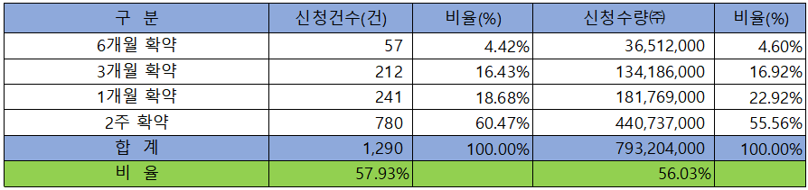 의무 보유 확약 건수는 1,290건에 793,204,000주로 전체 신청 물량 대비 건수로는 57.93%, 수량으로는 56.03%였으며, 2주 확약 비중이 제일 높았지만, 1개월과 3개월 6개월 순으로 상당수 확약이 이루어졌습니다.