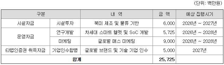 세나테크놀로지는 금번 공모를 통해 조달된 자금으로 북미 제조 및 물류 기반 확충 등 시설자금에 60억, 연구개발비로 57억, 타 법인주식취득에 50억을 사용한 후, 나머지 90억을 마케팅 비용으로 사용할 계획입니다.