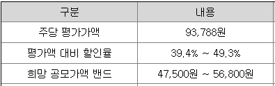 희망 공모가격은 47,500원 ~ 56,800원이고, KB증권과 신한투자증권에서 청약 가능합니다.