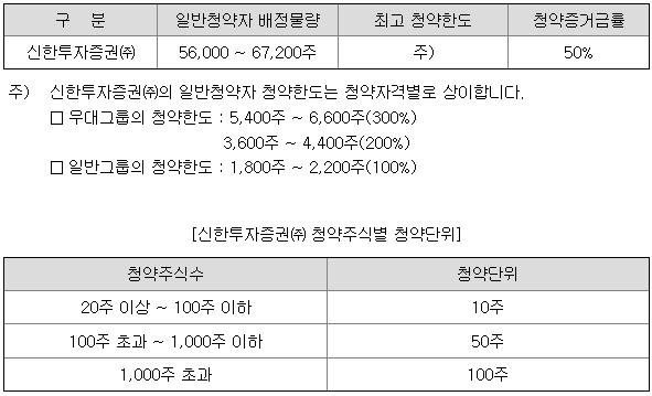 신한투자증권의 일반 청약자 배정 물량은 56,000주 ~ 67,200주이고, 일반 청약자의 최고 청약 한도는 일반 그룹 기준 1,800주 ~ 2,200주입니다.