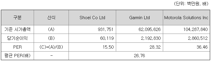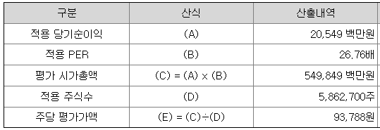 회사의 주당 평가가액은 2025년 반기 기준 직전 12개월의 순이익에 유사회사의 평균 PER 배수를 곱하여 회사가치를 정하고, 이를 주식 수로 나누어 산출한 것입니다.